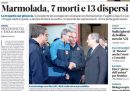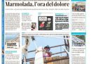 L’apertura di quasi tutti i giornali di oggi è dedicata ancora al crollo avvenuto domenica pomeriggio di una parte del ghiacciaio della Marmolada, che ha travolto gruppi di escursionisti provocando 7 morti e 13 dispersi, per i quali le speranze di ritrovarli in vita sono ormai praticamente nulle; sulle prime pagine si parla delle possibili cause del crollo, della visita sul posto del presidente del Consiglio Draghi, e delle storie personali delle vittime. Il Sole 24 Ore titola invece sugli aumenti del prezzo del gas, il Messaggero e Domani si occupano del rinvio dell’incontro fra Draghi e il leader del Movimento 5 Stelle Conte sui rapporti nella maggioranza di governo, Libero ipotizza l’uscita della Lega dalla maggioranza a settembre, il Fatto segue l’andamento delle operazioni militari in Ucraina, il Tempo apre sullo sciopero dei taxi di oggi e domani, e la Verità continua la sua campagna contro le misure per contrastare la diffusione del coronavirus, prendendosela oggi con i tamponi.