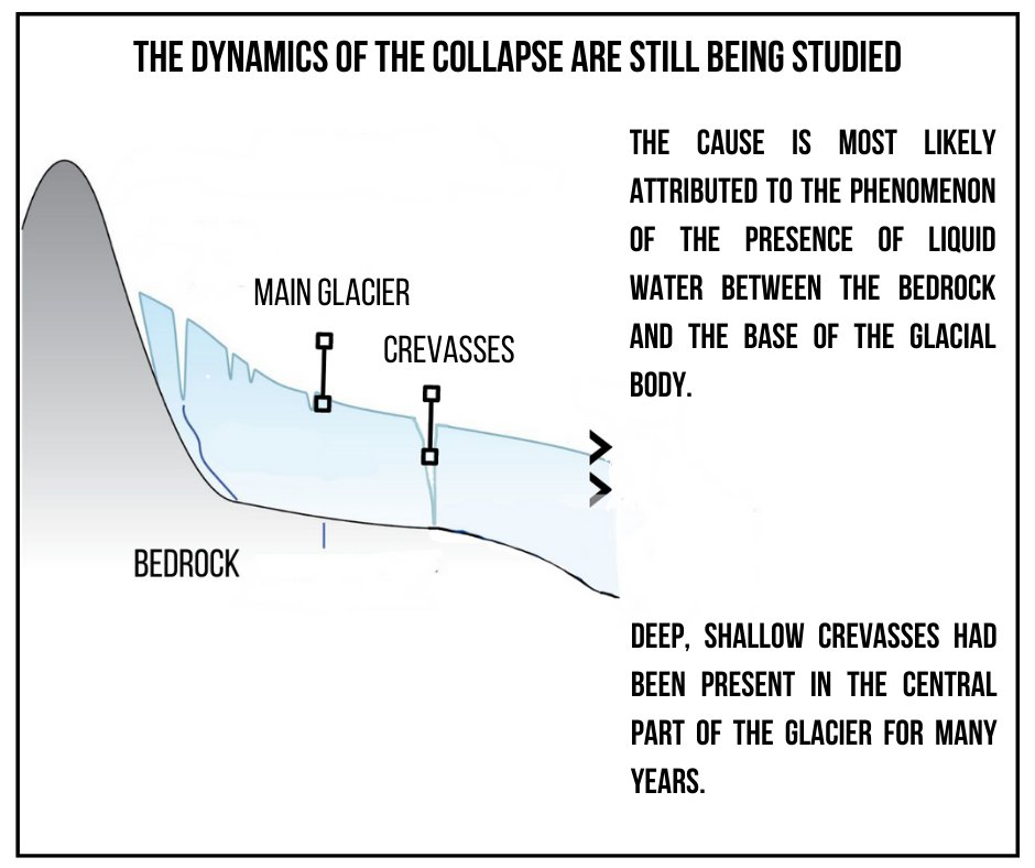 Tecnicamente la parte di ghiacciaio che è caduta non era un “seracco”, termine molto utilizzato nelle prime ore dopo il crollo che indica blocchi di ghiaccio molto staccati dal corpo principale di un ghiacciaio. Era invece una placca glaciale che solo negli ultimi anni si è divisa dal corpo principale del ghiacciaio a seguito della sua frammentazione.