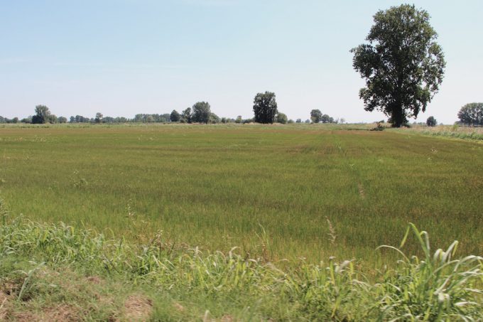 Il fosso accanto alla risaia di Alberto Fusar Imperatore è quasi vuoto. Da un rigagnolo emergono i sassi coperti da uno strato di alghe verdi, ai bordi i cespugli sono gialli, le zolle di terra secche e rigate. La poca acqua che passa attraverso la chiusa, il sistema idraulico che regola le fasi dell’irrigazione, allaga la risaia soltanto per una ventina di metri quadrati, in un periodo in cui tutto il campo dovrebbe essere sommerso.