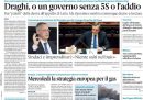 Tutti i giornali di oggi aprono sulla crisi di governo, e in particolare sull’ultimo giro di richieste che Giuseppe Conte ha fatto al presidente del Consiglio Mario Draghi, ma senza grandi novità: la situazione non si sbloccherà prima di mercoledì, quando Draghi parlerà al Parlamento per la prima volta dopo le sue dimissioni respinte dal presidente della Repubblica Sergio Mattarella. Sulle prime pagine sono citati anche i voli cancellati per i problemi delle compagnie aeree, i grandi incendi che hanno colpito Francia e Spagna e ancora la morte di Eugenio Scalfari.