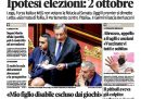 Tutti i giornali di oggi si occupano in apertura della giornata di ieri al Senato, dove il presidente del Consiglio Draghi ha perso la maggioranza che sosteneva il suo governo per la decisione di Forza Italia, Lega e Movimento 5 Stelle di non votargli la fiducia, in conseguenza anche del discorso inaspettatamente duro di Draghi in apertura della seduta. Oggi, secondo i giornali, il presidente del Consiglio dovrebbe presentarsi alla Camera per annunciare le sue dimissioni e poi andare al Quirinale per comunicarle al presidente della Repubblica Mattarella, che dovrebbe a quel punto sciogliere le camere e indire le elezioni anticipate, per cui si parla della data del prossimo 2 ottobre.