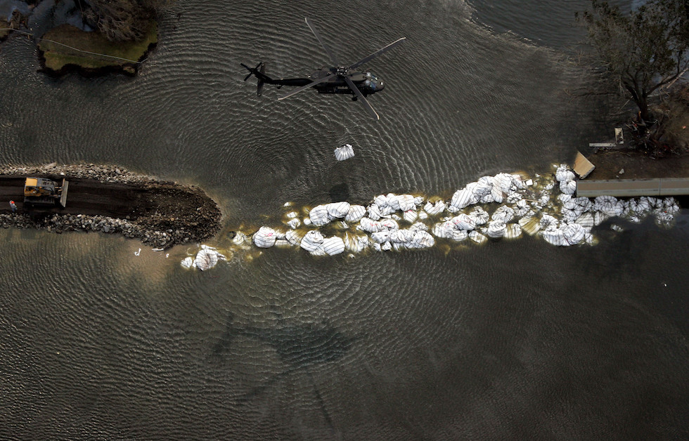 Un elicottero militare lascia cadere un sacco di sabbia durante i lavori di riparazione dell’argine del canale di navigazione a New Orleans, dopo l’uragano Katrina, il 5 settembre 2005 (AP/David J. Phillip)