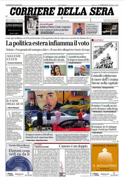 La maggior parte dei giornali di oggi si occupa in apertura dei rapporti fra la Lega e la Russia, dopo l’inchiesta pubblicata ieri dalla Stampa secondo la quale ci sarebbero stati contatti fra esponenti dell’ambasciata russa a Roma e un rappresentante della Lega nel mese di maggio per informarsi sulla possibilità che la Lega uscisse dalla maggioranza che sosteneva il governo Draghi. Repubblica apre invece sull’aumento degli arrivi dei migranti in Italia dalla Libia, il Messaggero si occupa ancora delle anticipazioni sul contenuto del nuovo “decreto aiuti”, e il Fatto critica le alleanze fra i partiti del centrosinistra.