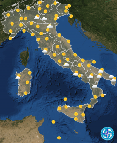 Dopo un paio di giorni un po’ più piovosi rispetto agli ultimi tempi, domenica sarà di nuovo una giornata soleggiata. Potrebbe piovere, brevemente, nel sud del Lazio e sulle montagne abruzzesi, e potrebbe verificarsi qualche temporale in Molise, lungo la costa tirrenica meridionale o nel nord-est della Sicilia. Le temperature massime aumenteranno in Friuli-Venezia Giulia, nord della Sardegna, regioni centrali tirreniche, Appennino marchigiano, Umbria e coste della Campania. Diminuiranno un po’ nel resto del Sud.