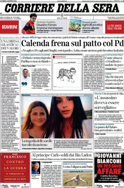 La trattativa fra il Partito Democratico e Azione per raggiungere un’alleanza in vista delle elezioni politiche del 25 settembre è la notizia di apertura sulla maggior parte dei giornali: dai titoli di oggi sembra che i vincoli posti da Calenda non consentano un accordo fra i due partiti, che stanno comunque ancora trattando. Le altre notizie principali sulle prime pagine sono la morte di due ragazze investite da un treno nella stazione di Riccione e le indagini sulla morte di Alika Ogorchukwu a Civitanova Marche, mentre i giornali sportivi si occupano di calciomercato e della giornata difficile per le Ferrari nel Gran Premio di Ungheria di Formula 1.