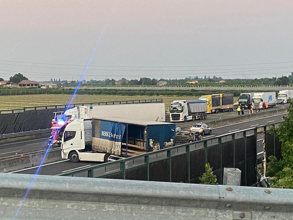 I tir messi di traverso dopo l’assalto sulla A1 tra Modena e Bologna, nel giugno 2021 (Ansa)