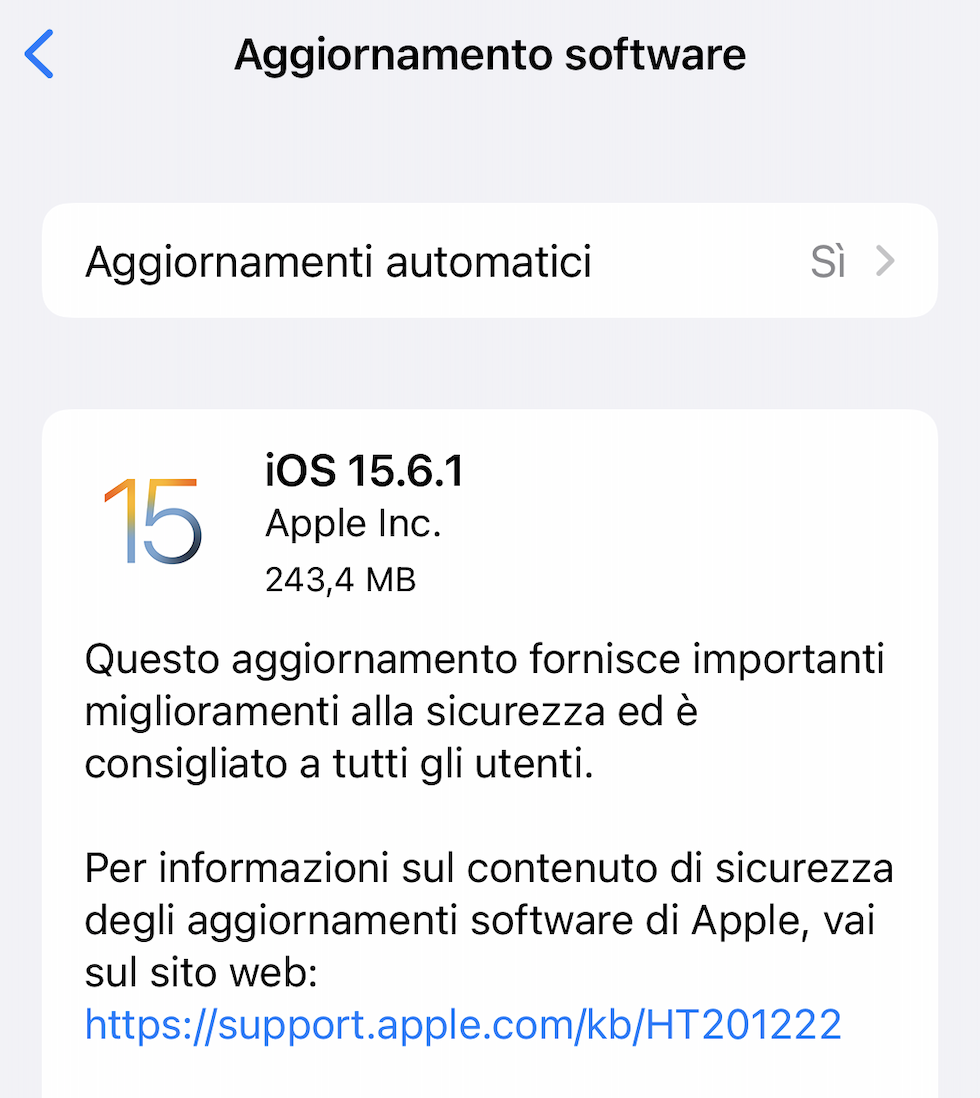 I dispositivi su cui è disponibile l’aggiornamento sono gli iPhone 6s e i modelli successivi, tutti gli iPad usciti dal 2014 in poi, l’iPod touch di settima generazione e tutti i computer che hanno installato un sistema operativo del tipo “macOS Monterey”. Se avete uno di questi modelli e non trovate l’aggiornamento, potreste averlo già fatto inavvertitamente o avere gli aggiornamenti automatici attivati.
