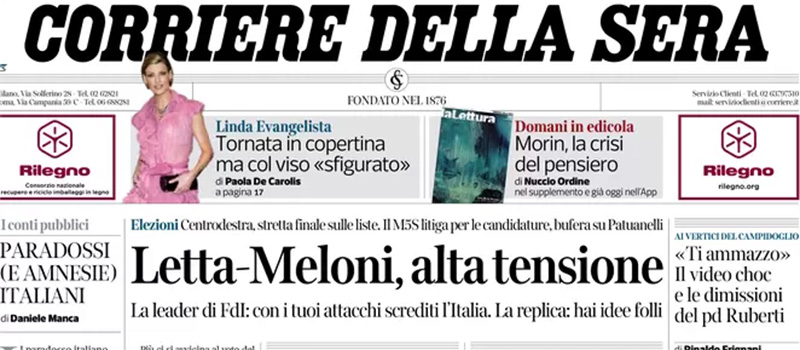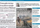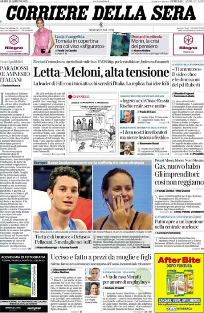 È sempre la campagna elettorale per le prossime elezioni politiche a occupare l’apertura dei giornali di oggi, con lo scambio di accuse fra il segretario del Partito Democratico Letta e la leader di Fratelli d’Italia Meloni: il primo in un’intervista alla tv americana CNN ha accusato la seconda di mettere a rischio il ruolo dell’Italia nell’Unione Europea, e Meloni ha risposto dicendo che Letta getta discredito sull’Italia. L’altra notizia è la diffusione da parte del Foglio di un video in cui il capo di gabinetto del sindaco di Roma Ruberti minaccia alcuni compagni di partito per motivi ancora non chiari, che ha portato alle dimissioni di Ruberti. Il Manifesto e Avvenire aprono invece sulla situazione della centrale nucleare di Zaporizhzhia, con il colloquio fra Putin e Macron durante il quale Putin si è detto disposto a consentire un’ispezione da parte dell’Agenzia internazionale per l’energia atomica.