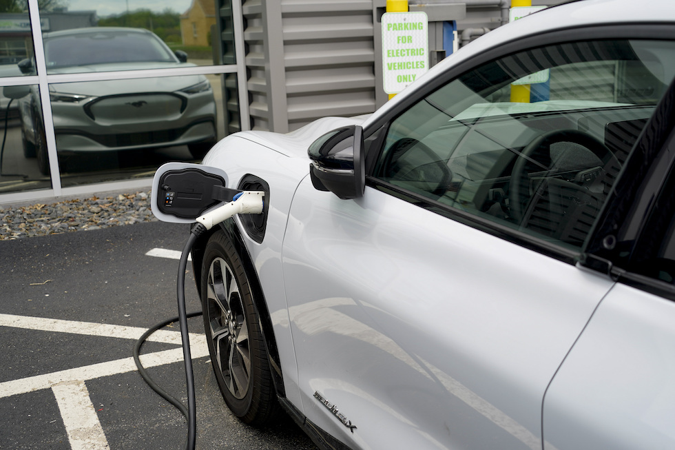 Una Ford Mach-E in ricarica in un parcheggio a Corte Madera, in California, il 27 giugno 2022 (Justin Sullivan/Getty Images)