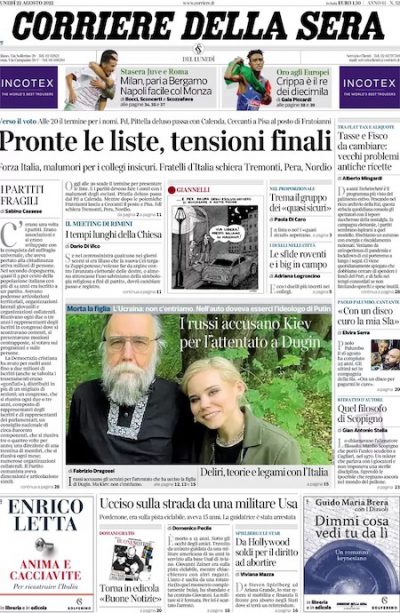 Su molti giornali nazionali di oggi si parla molto dell’assassinio di sabato sera di Darya Dugina, figlia di Alexander Dugin, ideologo di estrema destra molto vicino al presidente russo Vladimir Putin, di cui si sa ancora molto poco. Per la politica italiana, le notizie principali riguardano gli ultimi ritocchi dei partiti alle liste dei candidati alle elezioni del 25 settembre, che dovranno essere presentate entro questa sera. Continuano ad avere ancora molto spazio le discussioni sui dibattiti televisivi tra i leader di partito, con alcuni che si lamentano di essere stati esclusi dalla Rai. Per lo sport la notizia più rilevante è la vittoria del mezzofondista italiano Yeman Crippa nella gara de 10.000 metri agli Europei di atletica leggera.