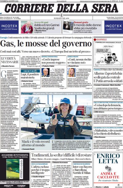 Diversi quotidiani nazionali stamattina aprono sul nuovo record raggiunto dal prezzo del gas, e sui pericoli che potrebbe comportare per molte aziende che fanno fatica a sostenerne i costi. Alcuni commentano la campagna di comunicazione lanciata dal Partito Democratico in vista delle elezioni. Repubblica invece apre con un’inchiesta realizzata con diversi altri giornali internazionali sulla presenza di spie russe nella NATO e in Italia. I giornali sportivi parlano ampiamente dei sorteggi dei gironi della prossima Champions League avvenuti ieri a Istanbul e soprattutto delle avversarie delle italiane, oltre che della giornata di Serie A che inizierà domani.