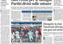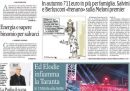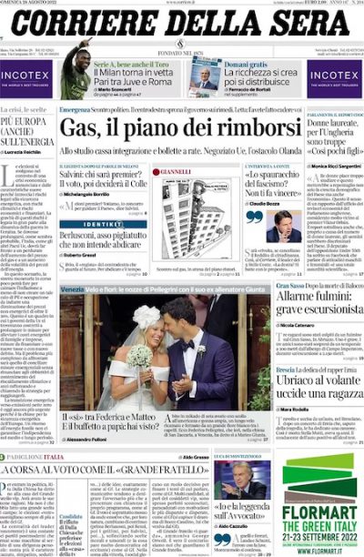 C’è ancora l’aumento del prezzo del gas sulle aperture di quasi tutte le prime pagine dei giornali nazionali di domenica: si parla soprattutto di un possibile decreto legge approvato con urgenza dal governo uscente di Mario Draghi per intervenire fin da subito per aiutare famiglie e aziende, senza aspettare la formazione di un nuovo governo dopo le elezioni. Per gli esteri, la notizia principale è la disastrosa situazione del Pakistan per via delle alluvioni degli ultimi mesi: da giugno le inondazioni hanno ucciso quasi mille persone e lasciato milioni di sfollati. Per il calcio, ci sono invece il pareggio tra Juve e Roma e la vittoria del Milan contro il Bologna negli anticipi di Serie A.