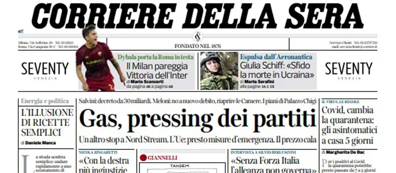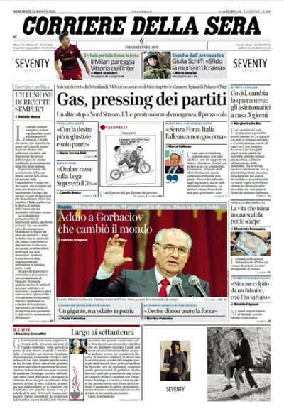Mentre molti giornali si occupano in apertura ancora dell’aumento del prezzo del gas, dell’attesa di misure che ne attenuino gli effetti per famiglie e aziende e degli effetti sulle attività industriali, altri titolano sulla campagna elettorale dei vari partiti e sui dati degli ultimi sondaggi in vista delle elezioni politiche del 25 settembre. Avvenire apre sulla condanna da parte del Vaticano della guerra di occupazione russa in Ucraina, Libero si preoccupa di come potranno votare i positivi al coronavirus, il Fatto critica ancora il governo Draghi, e i giornali sportivi commentano i risultati dei tre anticipi del turno infrasettimanale di Serie A.