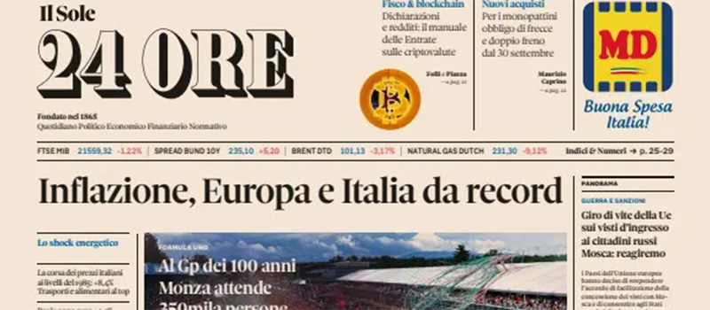 Sui giornali di oggi l’apertura è dedicata a notizie diverse: alcuni si occupano ancora del prezzo del gas e dell’attesa per nuove misure da parte del governo per contrastarne gli effetti, altri titolano sui dati diffusi ieri sull’inflazione in Italia e nell’Unione Europea a agosto, altri ancora ricordano più diffusamente l’ex leader dell’Unione Sovietica Michail Gorbaciov, morto martedì sera. Il Messaggero e Domani aprono sulla decisione del governo di negoziare la cessione di ITA Airways con il consorzio formato dal fondo statunitense Certares e dalle compagnie aeree Delta Air Lines e Air France-KLM, Repubblica pubblica i dati di un sondaggio sul voto dei giovani, il Giornale critica un film presentato alla Mostra di Venezia sulla marcia su Roma, e i giornali sportivi si occupano della vittoria della Juventus sullo Spezia nel turno infrasettimanale di Serie A.