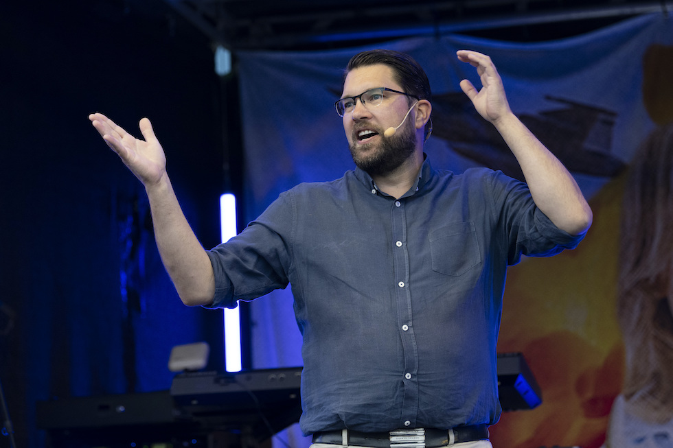 Jimmie Akesson durante un comizio elettorale (Henrik Montgomery/TT via AP)
