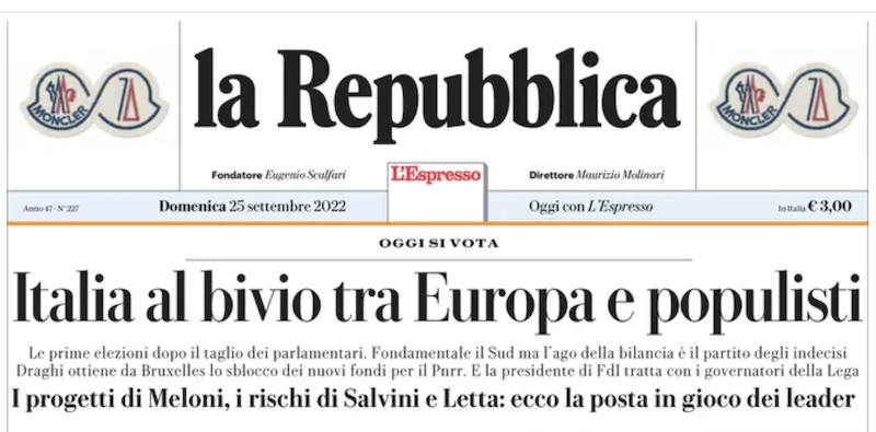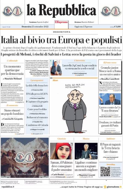 Quasi tutti i quotidiani oggi dedicano le proprie prime pagine alle elezioni politiche, con tutto quello che ci gira attorno: l’attenzione dei paesi stranieri, il rischio dell’astensionismo o l’appello a un voto “utile”, come suggerisce Domani. La Gazzetta di Reggio dedica spazio alle ultime ricostruzioni sul caso di Saman Abbas, la ragazza pachistana scomparsa nell’aprile del 2021 vicino a Reggio Emilia, mentre sui giornali sportivi si parla ancora della commozione del tennista Roger Federer alla conclusione della sua ultima gara.
