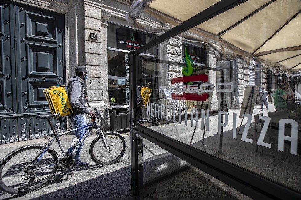 Un rider in attesa all’esterno di una pizzeria a Milano (AP Photo/Luca Bruno)