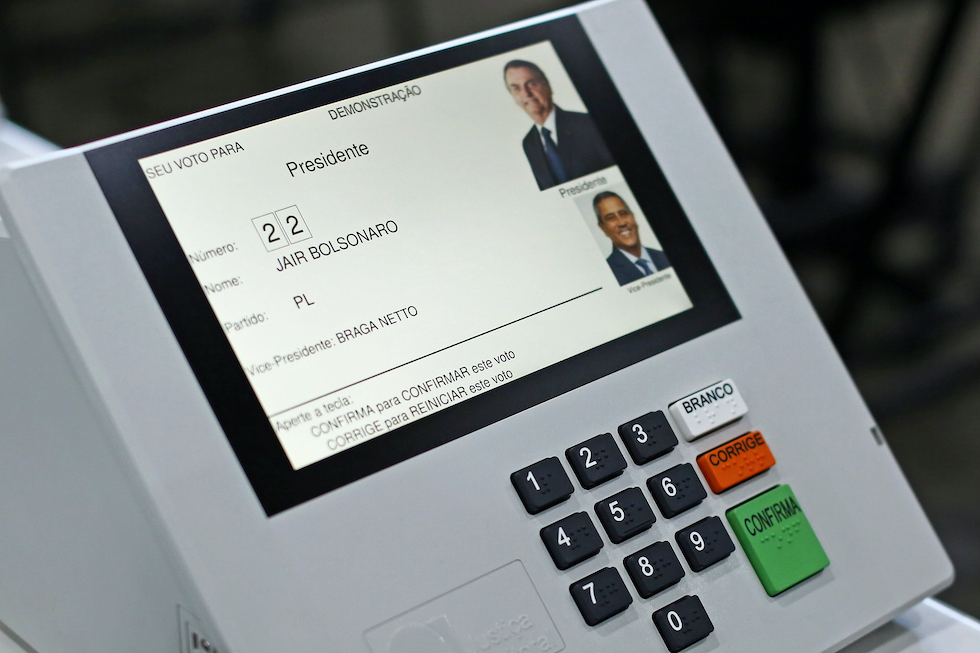 Un esempio dei computer per il voto che si trovano nei seggi brasiliani, in questo caso con il nome di Bolsonaro (Heuler Andrey/Getty Images)