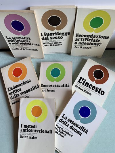 Tra le altre copertine, ci sono anche quelle di una collana di saggistica tascabile di Bompiani chiamata “I Satelliti” e pubblicata tra il 1971 e il 1974. Fin dall’inizio c’era l’idea di farne uscire solo 49 numeri e così Munari pensò alla seguente idea per la grafica di collana: su ogni copertina ci sarebbe stato un grande cerchio nero su sfondo bianco, rappresentante un pianeta, per ospitare il titolo; e poi per ogni numero della collana uscito prima di quello corrente ci sarebbe stato un altro cerchio più piccolo, un “satellite” appunto. Sulla copertina del primo numero della collana, L’uomo come fine di Alberto Moravia, si vede solo un grande cerchio nero; su quella dell’ultimo, La scienza e la classe operaia di A.A. Bogdanov, un cerchio grande e 48 più piccoli.