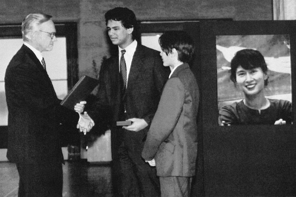 I due figli di Aung San Suu Kyi ritirano il premio Nobel per la madre nel 1991 (AP Photo/Bjoern Sigurdsoen)