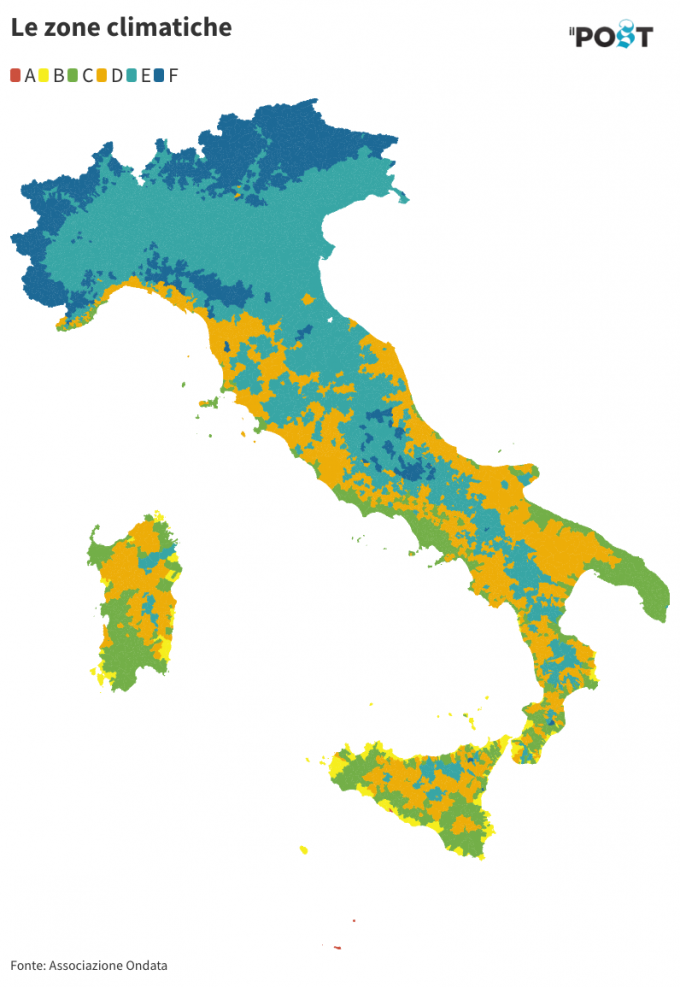 Questa mappa mostra la distribuzione dei comuni nelle diverse zone, dalla A alla F. È stata realizzata sulla base dei riferimenti normativi e citati dal ministero della Transizione ecologica, che però hanno una serie di problemi. Per quanto riguarda la divisione in zone, infatti, il decreto rimanda a un altro decreto del 1993, aggiornato più volte negli anni successivi fino al 2016, la versione oggi in vigore. Da 2016, tuttavia, ci sono stati molti accorpamenti di comuni e cambi di nome. Nonostante questo, il ministero non ha pubblicato un elenco aggiornato dei comuni divisi per zone. In assenza di un riferimento normativo certo, le zone di molti nuovi comuni sono state ricavate attraverso l’integrazione degli elenchi del 2016, resi disponibili dall’associazione Ondata, sulla base dei criteri legati all’altezza sul livello del mare e ai gradi giorno, un’unità di misura che consiste nella somma del divario tra la temperatura ambiente esterna, fissata a 20 °C, e la temperatura media esterna giornaliera.