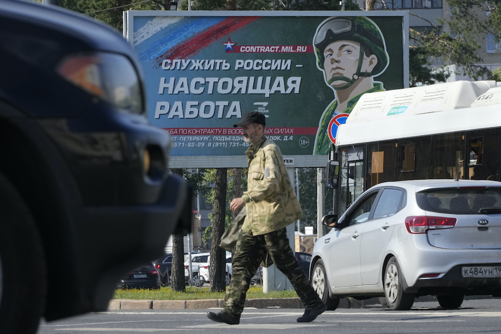 La pubblicità per il reclutamento nell’esercito a San Pietroburgo: «Servire la Russia è un vero lavoro!» (AP Photo/Dmitri Lovetsky)