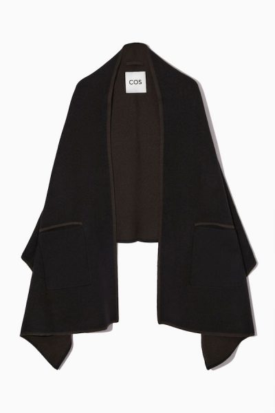 Un’altra cosa che si può fare è portarsi una sciarpa grande abbastanza da poter essere trasformata in una specie di mantellina: oltre a guardare sui siti dei marchi menzionati finora, si può cercare da H&M, dove è in vendita questa sciarpa misto lana e cashmere a 60 euro, o considerare questo scialle-mantellina di Cos in lana a 100 euro, ma anche questa sciarpa oversize in lana e mohair a 90 euro.