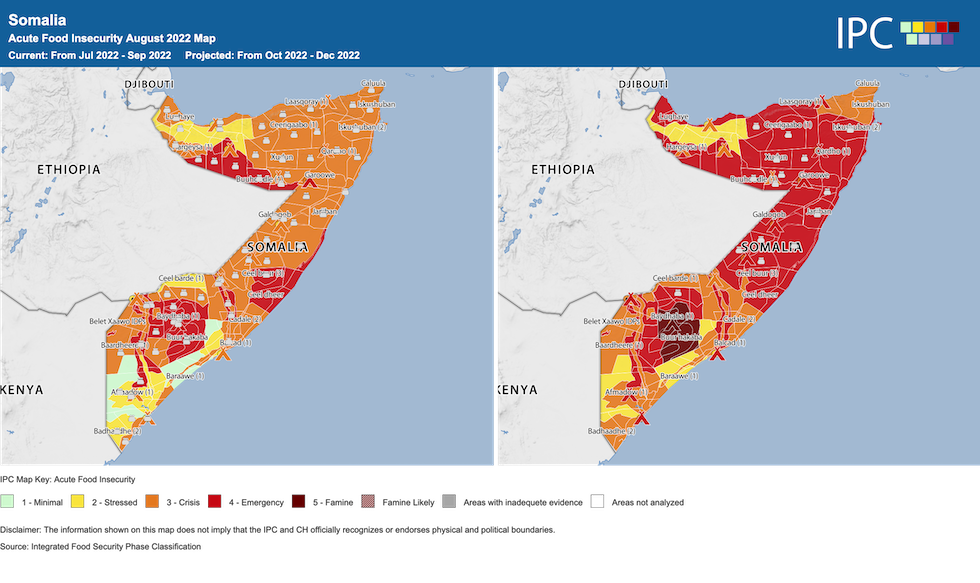 La mappa a sinistra mostra il grado di insicurezza alimentare raggiunto nelle diverse parti della Somalia tra luglio e settembre 2022 – le aree in arancione sono quelle in crisi, quelle in rosso dove la situazione era ancora più grave; la mappa a destra mostra le previsioni dell’IPC per il periodo compreso tra ottobre e dicembre 2022: le zone in rosso scuro sono quelle dove è prevista la condizione di carestia (IPC)