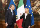 Questa mattina a palazzo Chigi si è tenuta la cerimonia per il passaggio di consegne tra il presidente del Consiglio uscente, Mario Draghi, e la leader di Fratelli d’Italia e nuova presidente del Consiglio Giorgia Meloni. Dopo una fotografia di rito, Draghi e Meloni si sono confrontati in un lungo colloquio riservato durato circa un’ora e mezza. Al termine dell’incontro c’è stata la “cerimonia della campanella” e alle 12:30 si è tenuta la prima riunione del Consiglio dei ministri del nuovo governo.