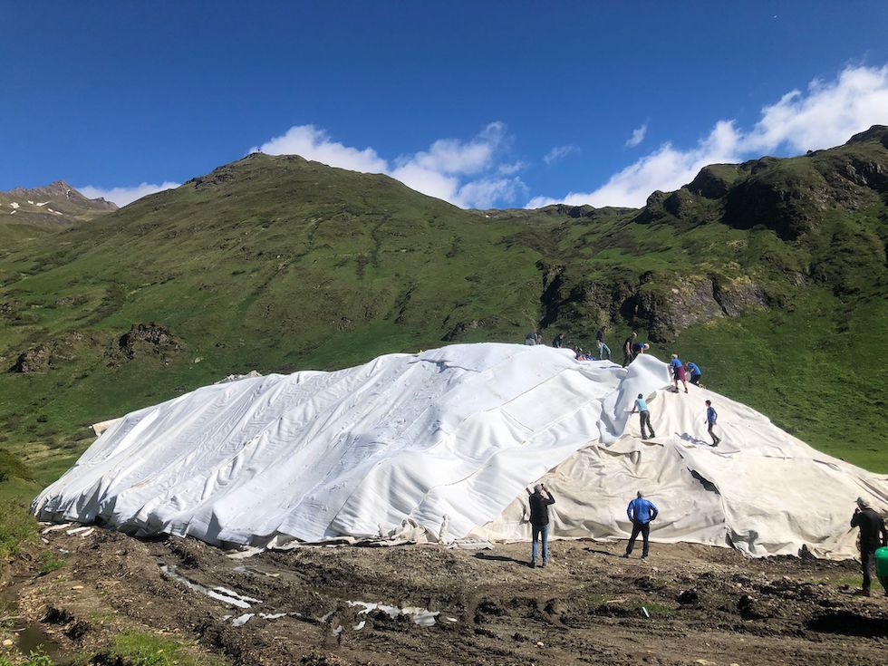 Barp capì che lo snowfarming «non era impossibile da realizzare» e nel 2020 ci riprovò con neve artificiale protetta con strati isolanti di ovatta e teli “geotessili”, con fibre di alluminio «legati uno all’altro con un sistema di velcri e cuciture a filo», il tutto con un approccio simile a quello usato, più in grande, per cercare di preservare alcuni ghiacciai.
