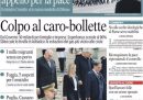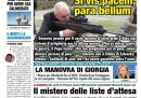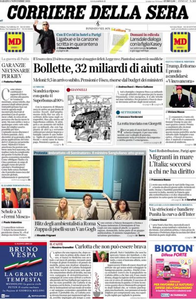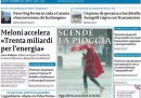 I titoli di apertura della maggior parte dei giornali di oggi si occupano delle misure annunciate ieri sera in una conferenza stampa dalla presidente del Consiglio Giorgia Meloni per contrastare gli effetti dell’aumento delle tariffe energetiche per famiglie e imprese, che prevedono uno stanziamento di 9,5 miliardi nel 2022 e di 21 miliardi nel 2023. Repubblica titola invece sulle navi delle organizzazioni non governative a cui il governo vuole impedire di far sbarcare in Italia i migranti salvati nel Mediterraneo, il Manifesto, il Fatto e Avvenire presentano la manifestazione per la pace di oggi a Roma, Libero accusa parte della magistratura di azioni politiche contro il governo, e Domani e il Tempo si occupano delle discussioni sul decreto contro i “raduni pericolosi”. I giornali sportivi presentano le partite della giornata di Serie A che si giocano oggi e domani.