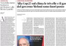La maggior parte dei giornali di oggi dedica l’apertura alla partecipazione della presidente del Consiglio Giorgia Meloni alla conferenza sul clima COP27 che si tiene a Sharm el Sheikh, in Egitto, e all’incontro che ha avuto con il presidente egiziano Abdel Fattah al Sisi, durante il quale si è parlato di gas, immigrazione e dei casi di Giulio Regeni e Patrick Zaki, fonti di tensione fra Italia e Egitto negli ultimi anni. Qualche giornale si occupa invece della gestione da parte del governo italiano degli sbarchi dei migranti salvati nel Mediterraneo dalle navi delle organizzazioni non governative, il Fatto titola sulla candidatura di Letizia Moratti alla presidenza della Regione Lombardia, e i giornali sportivi commentano il sorteggio degli ottavi di finale di Champions League, considerato favorevole per le squadre italiane.