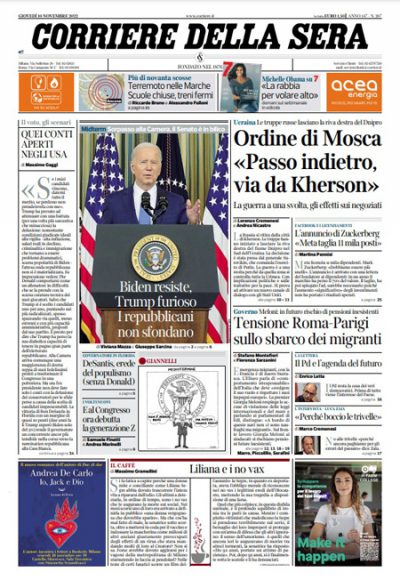 Le notizie in apertura sui giornali di oggi sono diverse: l’annuncio della Russia di voler ritirare le proprie truppe dalla riva sinistra del Dnipro, lasciando quindi la città di Kherson, i risultati delle elezioni di metà mandato negli Stati Uniti, con un risultato migliore rispetto alle attese per il Partito Democratico, le critiche della Francia alla gestione degli sbarchi dei migranti da parte del governo italiano, e il terremoto di ieri mattina nell’Adriatico di fronte alla costa delle Marche. Il Sole 24 Ore apre invece sulle modifiche al superbonus edilizio del 110% previste dal governo, mentre i giornali sportivi titolano sulla netta vittoria dell’Inter sul Bologna nella giornata di ieri in Serie A.