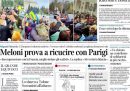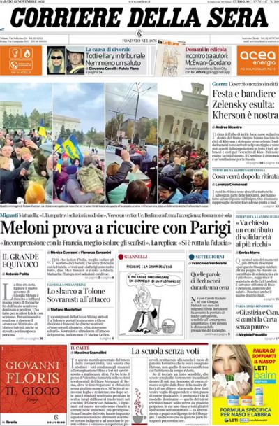 Sono due le notizie principali in apertura sui giornali di oggi: l’ingresso dei soldati ucraini a Kherson dopo il ritiro delle truppe russe dalla città, e le tensioni fra Francia e Italia sull’immigrazione dopo la decisione italiana di non far sbarcare in Italia i migranti salvati dalla nave Ocean Viking, arrivata poi nel porto di Tolone. Altri giornali titolano sulla riduzione decisa dal governo del superbonus edilizio, portato al 90%, mentre i giornali sportivi presentano le partite dell’ultima giornata di Serie A prima della lunga pausa per i Mondiali in Qatar.