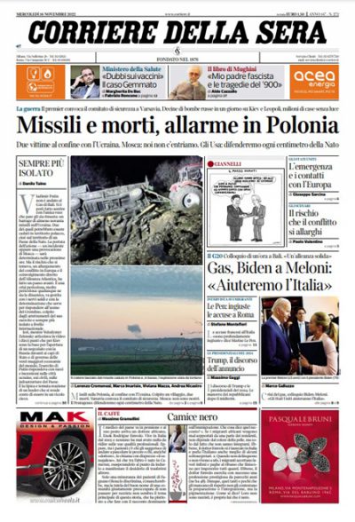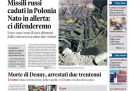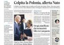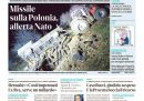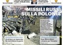 La notizia in apertura su quasi tutti i giornali di oggi sono le esplosioni avvenute nel tardo pomeriggio di ieri nella cittadina polacca di Przewodów, vicino al confine con l’Ucraina, che hanno provocato la morte di due persone, e che secondo le prime ipotesi potrebbero essere state causate da missili russi, non si sa se lanciati intenzionalmente verso la Polonia, o da frammenti di missili lanciati verso l’Ucraina e intercettati dalla contraerea. Fanno eccezione la Verità, che critica il presidente della Repubblica Mattarella per la telefonata con il presidente francese Macron, il Fatto, che critica il governo Draghi per la scarsa adesione alla quarta dose di vaccinazione contro il Covid-19, Domani, che critica il ministro Pichetto Fratin per la sua posizione alla conferenza sul clima Cop27, e Libero, che critica Roberto Saviano per le sue parole su Giorgia Meloni, quando era solo la leader di Fratelli d’Italia.
