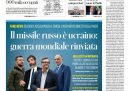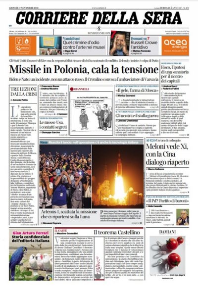 Ci sono notizie diverse in apertura sui giornali di oggi: alcuni titolano sul missile caduto martedì sera nel paese polacco di Przewodów, che sembra ormai certo fosse un missile delle difese aeree ucraine sparato per intercettarne uno russo lanciato verso l’Ucraina, altri aprono sul G20 di Bali e sull’incontro fra la presidente del Consiglio Giorgia Meloni e il presidente cinese Xi Jinping. Repubblica intervista il segretario della CGIL Landini che chiede al governo di intervenire per aumentare i salari, Libero difende Meloni dalle critiche per aver portato con sé la figlia al G20, e i giornali sportivi commentano la vittoria in amichevole dell’Italia di calcio contro l’Albania.