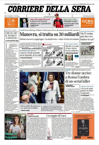 Ci sono notizie diverse in apertura sui giornali di oggi: le anticipazioni sulla legge di bilancio a cui sta lavorando il governo, il progetto di riforma delle autonomie presentato dal ministro Calderoli, sul quale ci sono pareri contrari soprattutto dalle regioni meridionali, le tre donne uccise ieri a coltellate a Roma, l’assoluzione di Silvio Berlusconi in uno dei processi “Ruby ter”, l’andamento della guerra fra Russia e Ucraina, il rapporto della Conferenza Episcopale Italiana sugli abusi nella Chiesa, e l’indagine sulle cooperative gestite dalla suocera del deputato Aboubakar Soumahoro, mentre la Stampa apre con un’intervista a Papa Francesco sulla guerra in Ucraina.