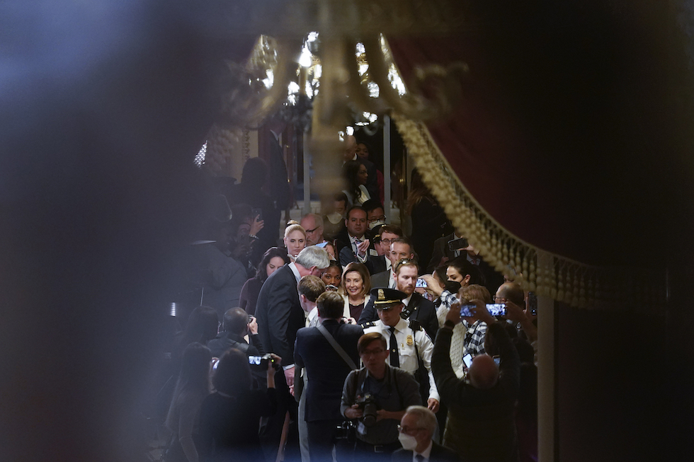 Nancy Pelosi all’approvazione alla Camera del disegno di legge di riforme sociali e ambientali del presidente Joe Biden, Washington, 19 novembre 2021 (AP Photo/J. Scott Applewhite)