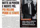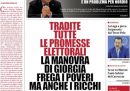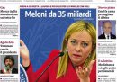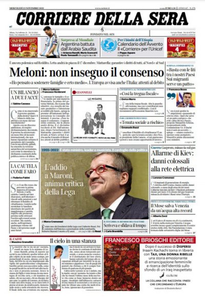I giornali di oggi si dedicano in apertura a illustrare i contenuti della bozza della legge di bilancio approvata dal governo e presentata ieri mattina dalla presidente del Consiglio Giorgia Meloni in una conferenza stampa: i temi principali nei titoli sono i tagli al reddito di cittadinanza, l’aumento delle pensioni minime, la riduzione del cuneo fiscale, gli aiuti per contrastare gli effetti degli aumenti delle tariffe energetiche, e le parole di Meloni, che ha detto di aver fatto una manovra per favorire famiglie e ceto medio. I giornali sportivi commentano i risultati delle partite di ieri ai Mondiali di calcio in Qatar, con la sconfitta a sorpresa dell’Argentina con l’Arabia Saudita e la vittoria della Francia.