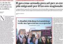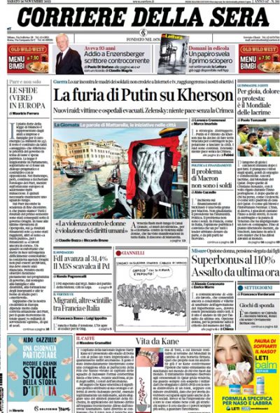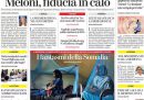 Ci sono molte notizie diverse in apertura sui giornali di oggi: alcuni si occupano della guerra in Ucraina, con i continui bombardamenti russi e la lettera del Papa al popolo ucraino, altri titolano sulla richiesta del presidente francese Macron che l’Italia accolga i migranti salvati nel Mediterraneo dalle navi delle organizzazioni non governative per continuare la redistribuzione fra i paesi dell’Unione Europea. Il Manifesto apre sulla giornata internazionale contro la violenza sulle donne celebrata ieri, la Verità e Libero si occupano dell’indagine sulle cooperative gestite dalla suocera di Aboubakar Soumahoro, e la Stampa presenta i dati di un sondaggio sulla fiducia nel governo Meloni.