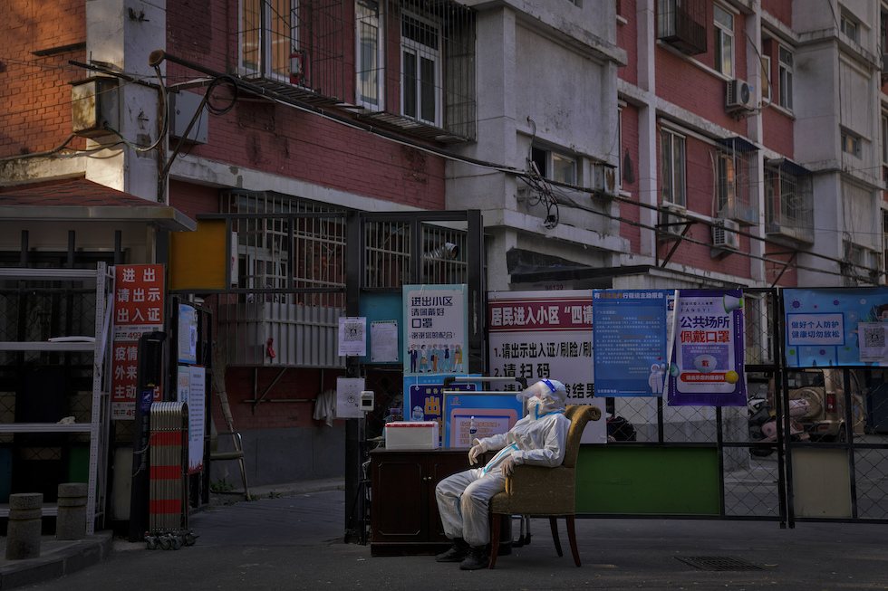 Una persona di guardia fuori da un palazzo di Pechino, il 23 novembre (AP Photo/Andy Wong)