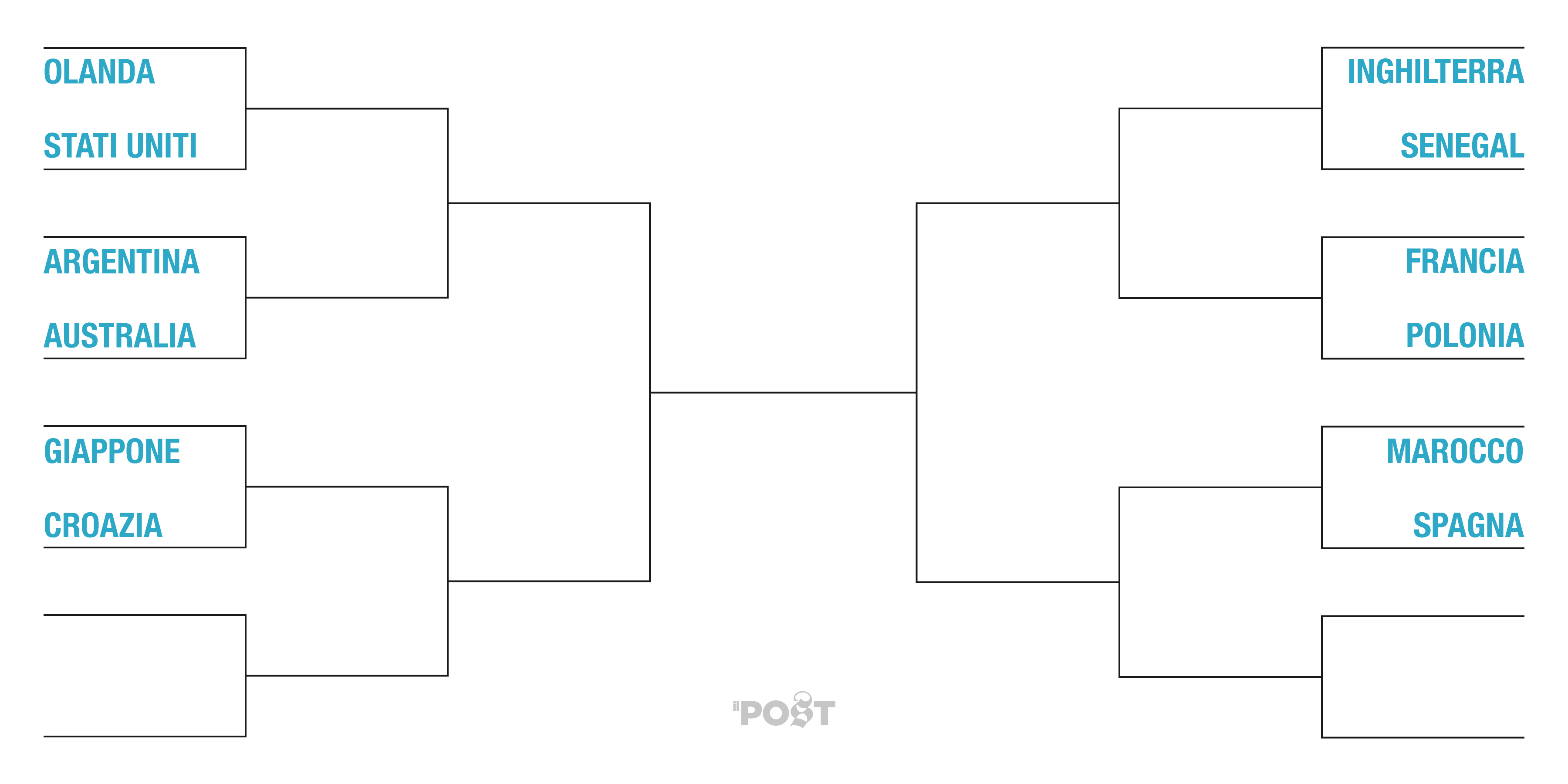 Le nazionali che fin qui si sono qualificate gli ottavi di finale sono Francia, Brasile, Portogallo, Olanda, Senegal, Inghilterra, Stati Uniti, Australia, Argentina, Polonia, Marocco, Croazia, Spagna e Giappone.