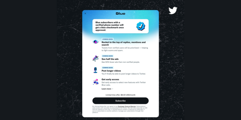 Inoltre, l’azienda richiede che gli account che vogliono accedere a Twitter Blue siano completi (ovvero abbiano un nome e una foto profilo), attivi (ovvero abbiano pubblicato qualcosa negli ultimi 30 giorni), e non ingannevoli (ovvero non facciano spam e non facciano finta di essere qualcuno che non sono). Una volta iscritti a Twitter Blue, chiunque cambi foto profilo, nome utente o nome visualizzato in cima al proprio profilo perderà la spunta blu fino a quando l’azienda non si assicurerà che il profilo “continui a soddisfare i suoi requisiti”. Non saranno permesse ulteriori modifiche durante il periodo di revisione.