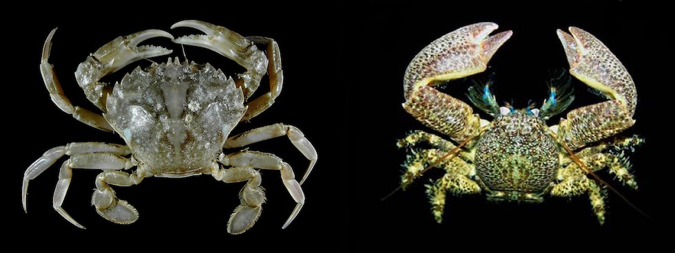 A sinistra un “vero granchio” (Liocarcinus vernalis) e a destra un “falso granchio” (Petrolisthes granulosus) – Wikimedia