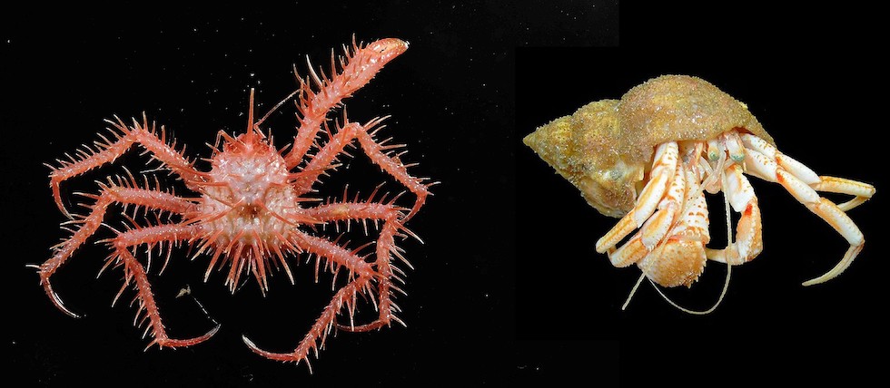 Una specie di granchio reale a sinistra e una di paguro a destra (Wikimedia)