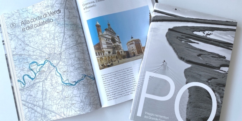 Il libro Po. Viaggio nei territori del Grande Fiume, di oltre 280 pagine, ideato graficamente dallo studio Tomo Tomo, è composto da tre parti, ognuna delle quali racconta il Po da un punto di vista diverso. La prima, Conoscere il fiume, lo racconta attraverso quattro forme narrative diverse. C’è un saggio dell’urbanista Albano Marcarini, Il Po, fiume d’Italia, che ne spiega la geografia, la storia, la cultura, raccontandone tutti i diversi elementi. Anche attraversare il fiume infatti ha avuto nei secoli significati diversi: