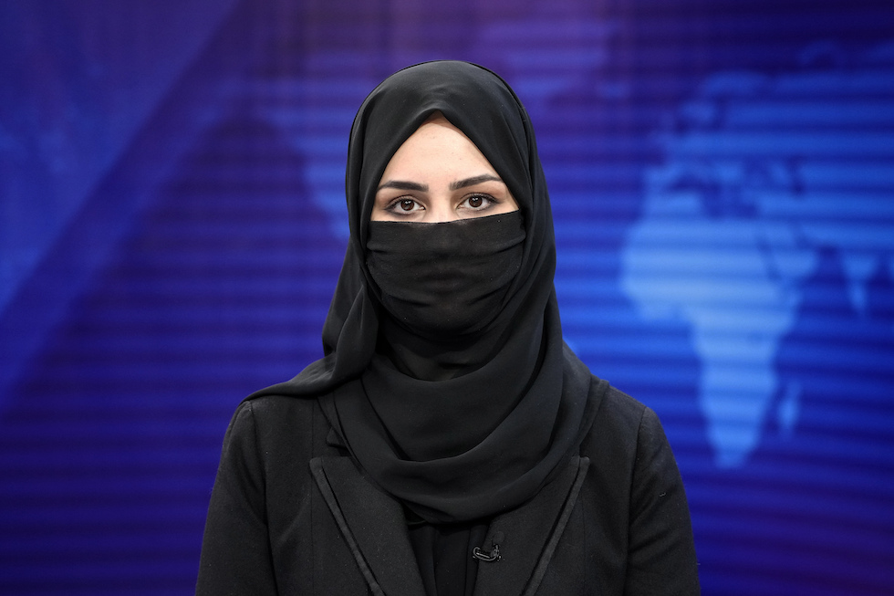 Una presentatrice televisiva afghana, sul canale televisivo afghano Tolo News, a maggio del 2022 (AP Photo/Ebrahim Noroozi)