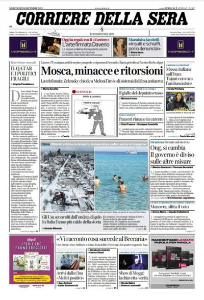 Ci sono molte notizie diverse in apertura sui giornali di oggi: le principali sono le minacce della Russia all’Ucraina e ai paesi che applicheranno un tetto al prezzo del gas, i contenuti della legge di bilancio e le discussioni sul nuovo decreto sulla sicurezza a cui sta lavorando il governo. Repubblica apre invece sulle critiche al presidente del Senato La Russa per le sue parole sul Movimento Sociale Italiano, la Stampa presenta un’inchiesta sullo stato della sanità in Italia, il Manifesto titola sulle proteste contro il regime in Iran, Avvenire commenta i dati sulle temperature medie in Italia nel 2022, Domani si occupa dei pestaggi del 2020 nel carcere di Santa Maria Capua Vetere, e il Giornale apprezza la scelta del governo di mantenere la dicitura madre e padre per i genitori sulle carte di identità.