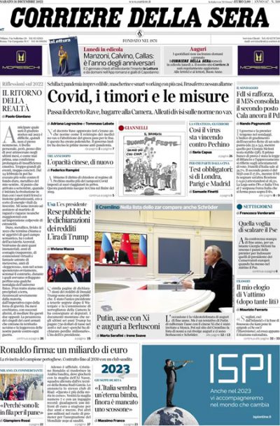 La circolare diffusa ieri dal ministro della Salute Schillaci sulla gestione del Covid è la notizia principale sulla maggior parte dei giornali di oggi: di fronte alle preoccupazioni per l’aumento dei casi in Cina, la circolare riconosce l’imprevedibilità della pandemia e indica in uso delle mascherine, smart working e vaccinazioni le misure che potrebbero essere adottate in caso di un peggioramento della situazione in Italia. Su molti giornali si fanno poi bilanci dell’anno che sta finendo e previsioni per il prossimo, mentre il Manifesto titola sul nuovo governo guidato dal presidente Lula in Brasile, e i giornali sportivi sono già orientati sul ritorno del campionato di calcio di Serie A maschile, che ricomincia mercoledì prossimo dopo la pausa per i Mondiali.