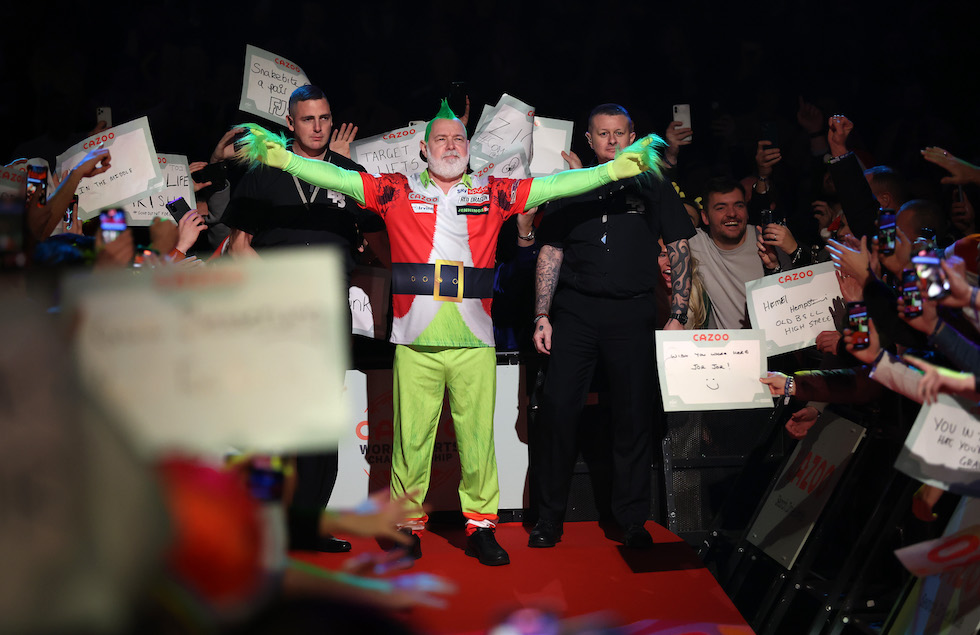 Peter Wright, il campione in carica, è stato eliminato al terzo turno, al quale si era presentato come di consueto introdotto dalla canzone “Don’t Stop The Party” di Pitbull (chi gioca a freccette ha una sua canzone d’ingresso, oltre a un soprannome), come al solito con una sgargiante cresta e vestito da Grinch.